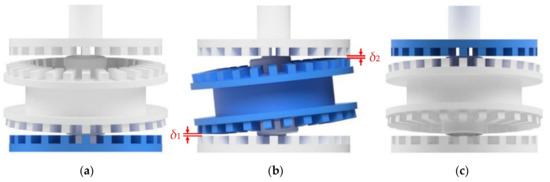 First, the geometry of the model was limited to the magnetically active materials such as ferromagnetic discs and permanent magnets. All structural components not interacting directly with the magnetic field, like an enclosure, bearings, shafts, and screws, were neglected. In the development of the mechanical design of the prototype, all auxiliary components potentially electromagnetically active (ferromagnetic, conductive components) were intentionally located at a minimum distance of 20 to 30 mm from the working air gaps in the magnetic field. Moreover, in the studies of torque transmission, the angular positions of the magnetically active elements of the gear were assumed to be known in advance according to the presented kinematical analyses. In other words, the model did not include equations of mechanical equilibrium of the system. Therefore, at the current stage of the research, the impact of the eddy currents induced in the massive conductive elements of the magnetic circuit was neglected. It should be emphasized that the calculation of the eddy currents in the magnetic circuit of such a complex structure is a challenging task in terms of the numerical analysis of systems with an electromagnetic field, and in general, it leads to the necessity of development and application of a model of coupled transient electromagnetic and mechanical phenomena. Such models have extremely high computational complexity, and thus their usefulness at the design stage of MPGs is limited. The general structure of the studied MPG model is shown in Figure 4a,b. The blue and red colours of the permanent magnet indicate its magnetization directions.
