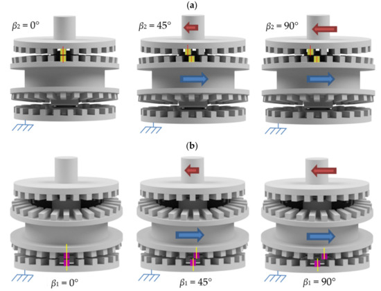 For example, if the mechanical angle β2m between the intermediate ring and the output ring is expressed by its relation to a number of magnetic pole pairs p on the output ring (β2 = β2m N4/2), the output torque Tout can be approximated by a sine function of the load angle β2. By analogy, Tbase can be expressed as sinusoidal dependence on the load angle β1 = β1m N1/2. A more complex situation occurs for torque Tin, in general, when the input torque is affected by both angles, i.e., it depends on the magnetic field distribution on each side of the intermediate ring. The load angles β2 and β1 defined for the studied system are illustrated in Figure 7a,b, respectively. The blue arrows indicate the direction of rotation, and the red ones indicate the direction of load torque.