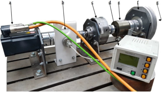 Overview of the test stand: a, servomotor; b, torque transducer 1; c, MPG prototype; d, torque-measuring interface; e, torque transducer 2; f, brake; and g, encoder.