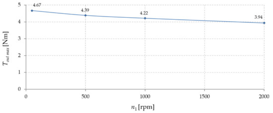 First, the dependence of the maximum load torque carried by the tested gearbox at different values of rotational speed of the input shaft was examined. The obtained characteristic is shown in Figure 10. A decrease in the maximum load torque transmitted by the examined gear at higher rotational speeds can be observed. Such behavior of the MPG can be explained by the impact of the eddy current losses induced in the steel cores [28] and the permanent magnets as well as magneto-mechanical resonances occurring in the studied gear [29,30].