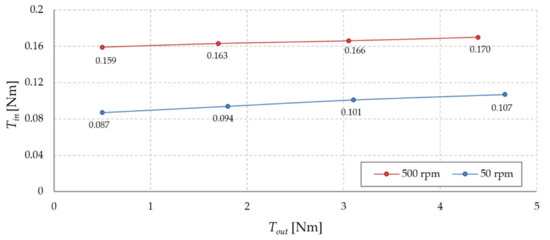 As can be observed, when the load torque increases, so does the input torque. Assuming that the efficiency of the MPG is equal to 100%, the input torque should depend only on the gear ratio and for the studied MPG design should be 144 times less than the load torque. For example, when the load torque equals 3 Nm, the input torque should be 0.021 Nm. Due to frictional and eddy current losses, the measured values of the input torque are about five times higher than in the ideal case.