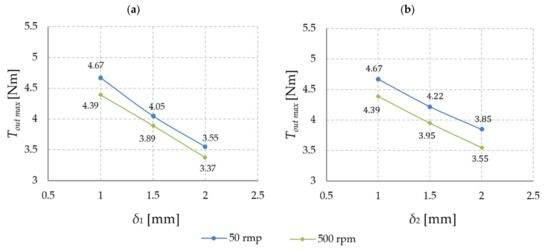 Maximum output torque dependence on the air-gap lengths δ1 and δ2 for: (a) δ2 = const = 1 mm and (b) δ1 = const = 1 mm.