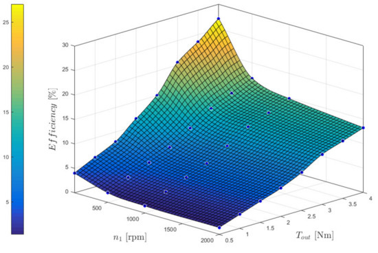 When the rotational speed is low, the losses in the system are mainly generated by the bearings, whereas with an increase in the rotational speed, the contribution of the eddy current losses becomes more crucial, which also results in deterioration of the overall efficiency. An increase in the load torque leads to an increase in the load angle between movable elements (described in Section 3) and, in consequence, to an increase in the magnetic torque, which influences the transmission efficiency. To illustrate the dependence of efficiency on rotational speed and load torque value, the efficiency map is shown in Figure 13.