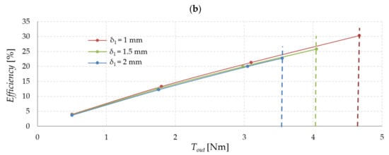 Next, the dependence of MPG efficiency on air-gap lengths was examined. The obtained gear efficiency vs. load torque characteristics determined for an input speed equal to 50 rpm and different values of air-gap lengths are shown in Figure 14. Dotted vertical lines in Figure 14 indicate the maximum load torque that the gear is able to transmit. It can be noticed that the air-gap lengths have a marginal impact on the slope of the efficiency characteristic; however, due to a change in Tout max, the maximum value of efficiency undergoes significant changes.