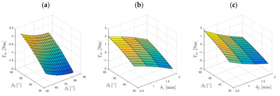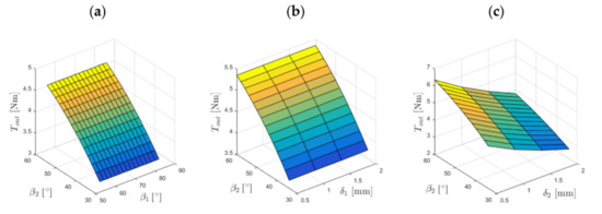 The input torque Tin as a function of (a) β2, β1 (for δ1 = δ2 = 1 mm); (b) β2, δ1 (for δ2 = 1 mm, β1 = 58°); and (c) β2, δ2 (for δ1 = 1 mm, β1 = 58°).