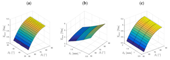 Regarding the dependence of the input torque Tin on the studied parameters, it can be seen that it is much more complex than for Tbase and Tout. The input torque depends on magnetic field distributions in both air gaps, and therefore, its value will be affected by both air-gap lengths δ1 and δ2 as well as both load angles β1 and β2.
