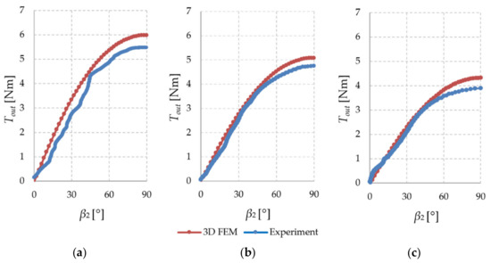 Comparison of measured and calculated output torque Tout with internal load angle β2 characteristics for (a) δ1 = δ2 = 1 mm; (b) δ1 = 1 mm, δ2 = 1.5 mm; and (c) δ1 = 1 mm, δ2 = 2 mm.