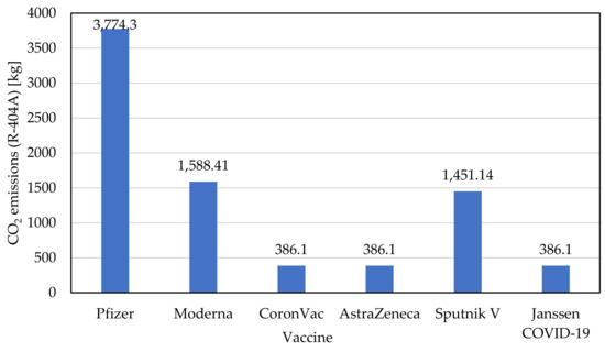 The refrigerant loads were simulated in FAPRO Laboratories in Curitiba-Paraná, Brazil. Figure 1 shows the differences between the environmental impact in terms of CO2 emissions, assuming the use of R-404A initial refrigerant load. Despite the heat load for the Pfizer–BioNTech vaccine, it is 2.2-times greater than that of Oxford–AstraZeneca, CoronaVac and Janssen COVID-19 (see Table 2). The environmental impact due to the refrigerant, which is required to comply with the needed storage temperature, has a difference of almost 10 times.
