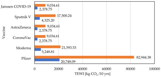 There are several indications that the vaccine against COVID-19 should be administered annually, due to mutations in the virus [36]. In this case, the use of the Vaccine TEWI indicator in the lifecycle of a refrigeration system is the best way to apply the calculation for a simulation; a lifecycle of 10 years has been used.