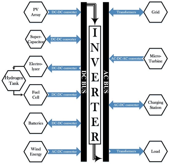 Figure 1 shows the schematic diagram of the proposed microgrid. It consists of multiple renewable energy resources connected to a DC bus through converters. The 260 kW PV array, 165 F super-capacitor bank, 150 kW electrolyzer, 260 kW SOFC, 200 Ah batteries, and 100 kW wind turbine are connected to the DC bus via DC–DC and AC–DC converters. The 11 kV grid, 200 kVA micro-turbine, bidirectional smart charging station, and load are connected to the AC bus via transformers, as well as AC–DC–AC and AC–DC converters. The DC bus is interlinked with the AC-bus through the main inverter. The technical details of the proposed microgrid and solar profile are provided in [].