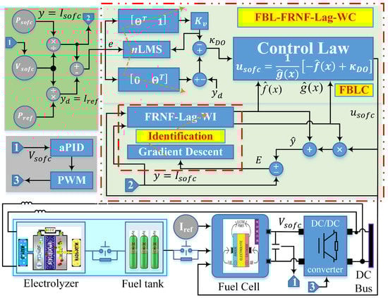 Figure 2 shows the schematic diagram of the internal closed-loop control scheme for the SOFC suggested in this research work. The actual output voltage, reference power, and actual output power are used to generate the input error signal, which is the input to adaptive FBL control. The control scheme generates the output control signal for the SOFC according to the internal structure of the control scheme, as described in Section 3.1.