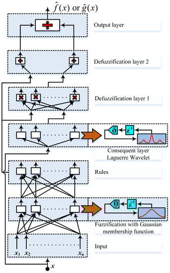where . For the best approximation of and in (17), a multi-layer FRNF-Lag-WC is used in this research work, as shown in Figure 3 []. The input to the FRNF-Lag-WC is the difference between the actual and reference current of the SOFC. The outputs of FRNF-Lag-WC are estimated nonlinear functions and . The identified nonlinear system is given as: