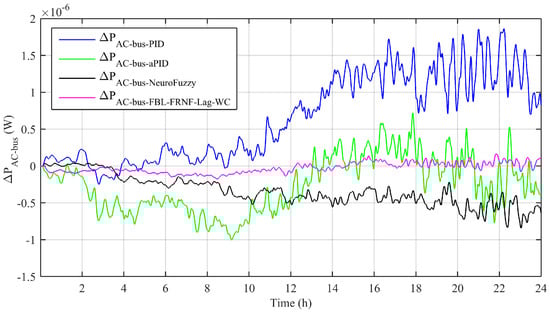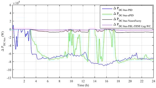 Figure 6 shows the net power on the DC bus. The net power on the DC bus had small variations for the adaptive FBL-FRNF-Lag-WC due to the multiple renewable energy resources and the action of many converters on the bus. The variation was also caused by the variable output of the maximum of the RESs attached to the DC bus. However, the magnitudes of variation due to the adaptive NeuroFuzzy, conventional PID, and aPID control schemes were of much higher magnitudes compared to that of the adaptive FBL-FRNF-Lag-WC.