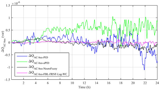 Figure 5 shows the net reactive power on the AC bus. Like the net real power, it must also be zero to ensure the stability of the AC bus. It is obvious that the net reactive power for the adaptive FBL-FRNF-Lag-WC is negligible. However, the variation is caused by the use of several converters attached to the AC bus, along with a varying load consisting of a large number of machines. The net reactive power due to the adaptive NeuroFuzzy, PID, and aPID control schemes shows a higher magnitude for the same system compared to the adaptive FBL-FRNF-Lag-WC.