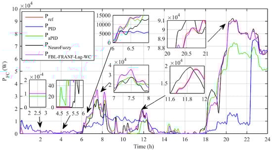 The SOFC continuously provides power to the DC bus via a converter. Figure 7 shows the electrical output power obtained through the conversion of electrochemical energy within the SOFC. The complete one-day output power profile was based on various load changes and the peak demand. The output power followed the reference signal for the adaptive FBL-FRNF-Lag-WC and gave a higher magnitude of produced power. The output power tracked by the adaptive NeuroFuzzy and the conventional controllers gave low magnitudes, and at certain intervals of time, the conventional control schemes failed to track the desired power flow.