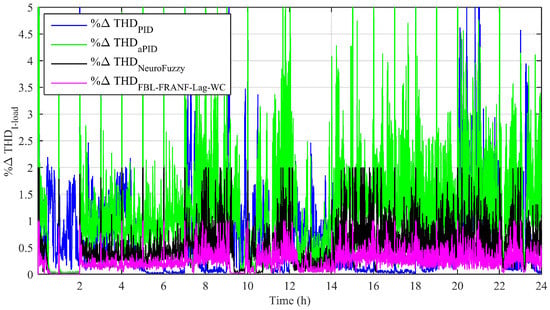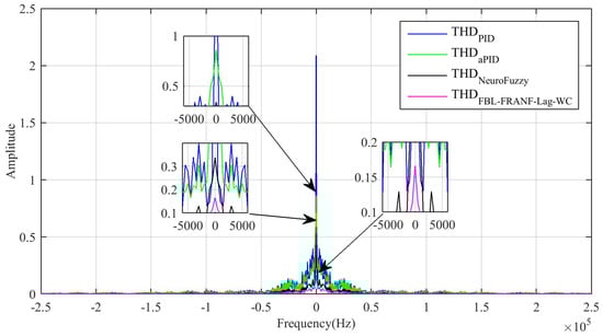 Power quality is one of the most important factors of a power system; it directly affects the overall performance of the system. The total harmonic distortion (THD) produced due to the source converters and load must be zero. However, their presence cannot simply be neglected due to various factors related to power generation from renewable resources, the use of the converters, and the transformers in the whole power system. The content of the THD can be reduced in a power system according to IEEE standards []. Figure 8 shows the THD content of the load current produced during the simulation of the various control schemes. The THD produced by the adaptive FBL-FRNF-Lag-WC had the lowest magnitude compared to the other control schemes, which guaranteed the power quality applied to the microgrid.