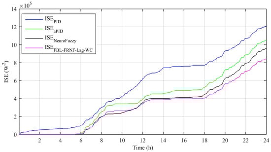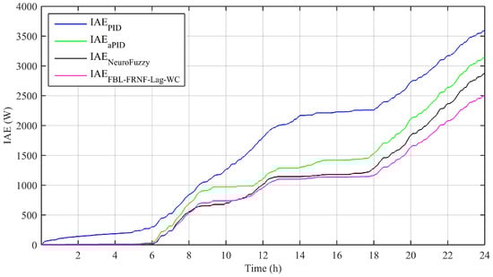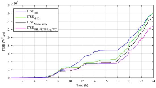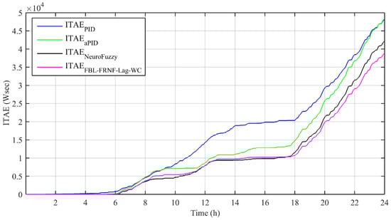 Performance indices, such as the integral absolute error (IAE), integral time-weighted absolute error (ITAE), integral squared error (ISE), and integral time-weighted squared error (ITSE), are shown in Figure 10, Figure 11, Figure 12 and Figure 13, respectively; they were calculated based on the difference between the reference and tracked power, as obtained from Figure 7. The detailed mathematical equations of these indices are given in []. The results show that the performance of the adaptive FBL-FRNF-Lag-WC is superior to those of the adaptive NeuroFuzzy, PID, and aPID control schemes.
