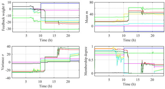 Figure 14a shows the updating of the feedback weight of the Gaussian membership function according to (32), Figure 14b shows the updating of the mean of the Gaussian membership function m according to (30), Figure 14c shows the updating of the variance of the Gaussian membership function according to (31), and Figure 14b shows the Gaussian membership degree according to (21) for both and , respectively.