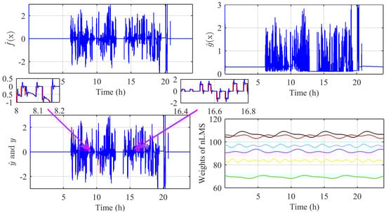 Figure 15a shows the estimated function , and Figure 15b shows the estimated function . It must be noted here that should never be equal to zero at any time instant because of its presence in the denominator of (17). Therefore, a switch is used in the simulation that gives a value greater than 0 whenever a zero comes into . Figure 15c shows the original signal obtained from the SOFC and the identification of it using the FRNF-Lag-WC. This reveals that the identification of an SOFC system is successfully done by the FRNF-Lag-WC, thus proving the adequacy of the proposed control scheme in real-time applications. Figure 15d shows the updating of the weights of nLMS, which depicts the adaptive behavior of the FBL control scheme.