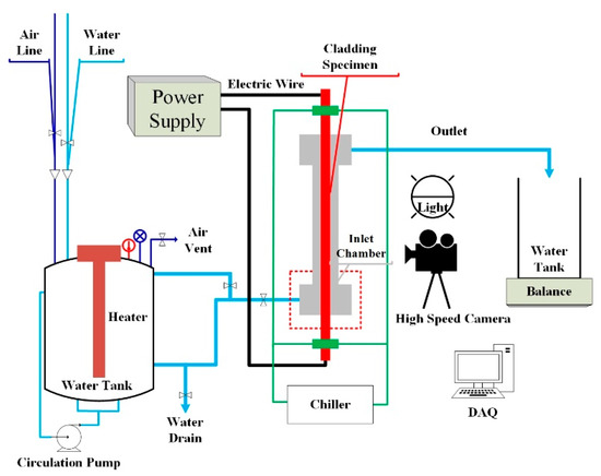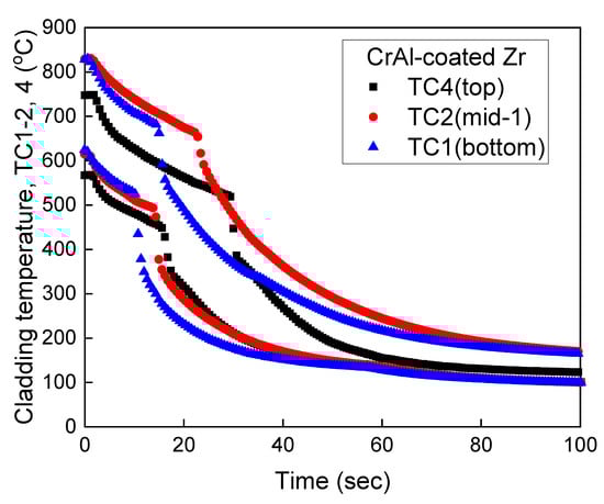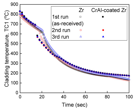 Recently, Lee et al. [18] carried out a quenching experiment with tube specimens for Cr-alloy-coated Zr cladding at 600 °C in a water pool. The Cr-alloy-coated Zr cladding showed quenching performance, e.g., quenching time and MFBT, similar to that of an uncoated Zr cladding. They also found that the quenching time is shorter for thinner coating. However, this experiment does not represent the reflooding of emergency core cooling water and the peak cladding temperature (PCT) in the event of LOCA. Hence, a reflood quenching experiment is still required to assess the cooling performance and interface integrity of the Cr-alloy-coated Zr cladding during LOCA reflooding.