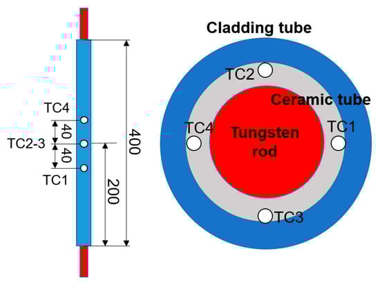 The test specimen shown in Figure 2 consists of a cladding tube, ceramic tube and tungsten rod. The ceramic tube is used to electrically isolate the cladding tube from the tungsten rod. The four TCs are placed in between ceramic tube and cladding tube. It is noted that four TCs (TC1-4) are installed in three axial locations with two TCs in the center of tube specimen. The axial distance between the TCs is 40 mm. The outer diameter, thickness and length of uncoated Zr cladding are 9.5, 0.57 and 400 mm, respectively. The diameter and length of tungsten rod is 4 and 500 mm.