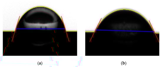 Contact angle of as-received specimen for; (a) Zr cladding (θ = 66°); (b) CrAl-coated Zr cladding (θ = 57°).