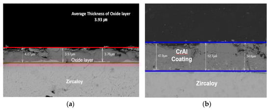 Figure 4 compares the cross-sectional SEM images for Zr and CrAl-coated Zr claddings after quenching test. The SEM image in Figure 4a is the Zr specimen after six times quenching tests at 600 °C. Figure 4b shows the SEM image of CrAl-coated Zr specimen after eight and six quenching tests at 600 °C and 800 °C, respectively. The Zr specimen shows an oxide layer of 3.93 μm thickness on the outer surface. It was also found that the oxide layer for Zr specimen increases as the quenching test is repeated. The CrAl-coated specimen in Figure 4b shows the coating layer of 50 μm on the outer surface of Zr cladding but no oxide layer. This indicates that the CrAl-coated Zr cladding is highly resistant to high temperature oxidation as designed.