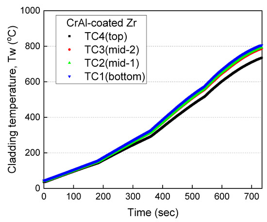 The water tank is filled with DI water and the water temperature is maintained at the target temperature using an electrical heater. A water pump recirculates the DI water in water tank from bottom to top in order to prevent thermal stratification. The coolant pipeline from water tank to test section is thermally insulated and heated by ribbon heater in order to maintain the coolant temperature at target value. The electrical current of DC power supply for tungsten rod increased continually such that the cladding temperature reaches its target temperature. Figure 5 illustrates the heat-up of CrAl-coated Zr cladding. It took approximately 700 s for the cladding temperature to reach 800 °C. During the heat up of test specimen, the bottom and top cooling chambers are cooled down by circulating cold water from the water bath at constant temperature, i.e., 7 °C.