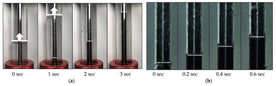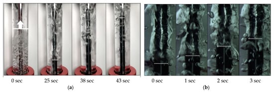 Figure 8 and Figure 9 show the quenching visualization of uncoated and CrAl-coated Zr claddings under high subcooling conditions, i.e., Tsub = 50 °C. The digital camera pictures show the water level in the test section marked by a white solid line. The pictures of the high-speed camera for 0.6 s show a stable and thin film on the cladding surface. The high-speed images also show clearly the quench front (dot line) moving upwards. The quench front for Zr cladding appears to be symmetric in circumferential direction as shown in Figure 8. The flow pattern and the speed of quench front appear to be almost same for uncoated and CrAl-coated Zr claddings. However, Figure 9 shows an asymmetric quench front for the CrAl-coated Zr cladding. This might be caused by non-uniform coating in Figure 4 and an unsmooth surface of CrAl-coated Zr cladding. Lee et al. [18] provided SEM images of CrAl-coated Zr cladding that show an unsmooth surface after polishing. It can be noted that the quench front at high subcooling is much faster than that at low subcooling. The top-down quenching was also observed under certain test conditions because of rapid cooling in the top portion of cladding specimen.
