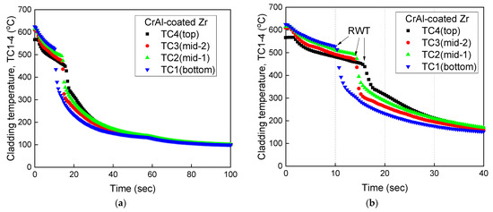 Figure 11 shows the quenching curve of the CrAl-coated Zr at Tw = 600 °C, Tsub = 5 °C and Vc = 0.05 m/s. It shows a gradual decrease of the cladding temperature due to film boiling in the early stages of quenching. The transition to nucleate boiling can be also seen in the quenching curve by the rapid drop in cladding temperature in between 10 s and 20 s. Figure 11b clearly shows the sequence of transition boiling from bottom to top of the cladding specimen. The cladding temperature at the bottom (TC1) and top (TC4) sections show the transition at 10 s and 16 s, respectively. It is also noted that the cladding temperature at the middle section (TC2 and TC3) indicates transition boiling at the same time, e.g., 14 s. The rewetting temperatures (RWTs) appear to be approximately 490 °C and 525 °C at the middle and bottom sections, respectively. The RWT is defined as the transition temperature from film boiling to nucleate boiling in this paper as indicated in Figure 11b.