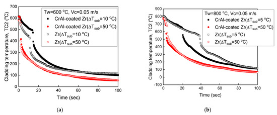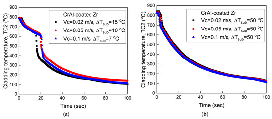 Figure 13 shows the effect of reflood velocity on the quenching performance of CrAl-coated Zr cladding. The reflood velocity (Vc) was changed to 0.02, 0.05 and 0.1 m/s. The initial cladding temperature is 800 °C and the coolant subcooling is 7–15 °C for low subcooling and 50 °C for high subcooling. The low reflood velocity (Vc = 0.02 m/s) appears to result in faster cooling under low subcooling conditions in Figure 13a. This is because the coolant subcooling for low reflooding is higher than those for high reflooding cases. It should be noted that the coolant temperature is slightly different from the target value under the low subcooling conditions. Figure 13b compares the quenching curves at high subcooling, i.e., Tsub = 50 °C. It shows almost same quenching curves for the three reflooding cases. Therefore, the reflood velocity seems to have a minimal effect on quenching characteristics such as RWT and cooling rate in film boiling.