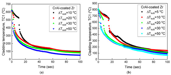 Figure 14 shows the effect of coolant subcooling for CrAl-coated Zr cladding. The initial cladding temperature is 600 °C and 800 °C with the constant reflood velocity of 0.05 m/s. The coolant subcooling ranges from 5 °C to 50 °C. The duration of film boiling decreases significantly as the coolant subcooling increases. The vapor film is very thin and disappears shortly after the coolant reflooding under high subcooling conditions, e.g., Tsub > 30 °C. The duration of film boiling is 10 s for the subcooling of 10 °C at Tw = 600 °C as shown in in Figure 14a. Figure 14b indicates the duration of film boiling for 14 s and 7 s for the subcooling at 10 °C and 20 °C, respectively. The RWT appears to increase significantly when the coolant subcooling is higher than 20 °C. Hence, the fast cooling is possible for the CrAl-coated Zr cladding if the coolant subcooling is higher than 20 °C.