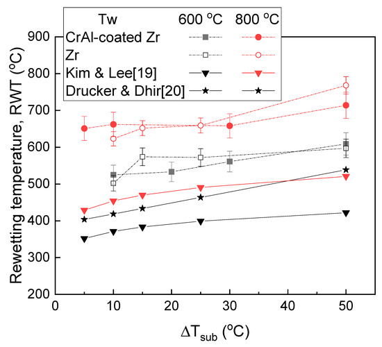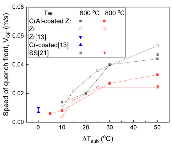 The speed of the quench front increases significantly as the coolant subcooling increases. However, it decreases as the initial specimen temperature increases. Stepanek et al. [21] also found the same dependence of quench front velocity on coolant subcooling and initial temperature from the reflood quenching of stainless steel (SS) rod. The quench front velocity of this experiment agrees well with the previous experimental data of Seshadri and Shirvan [13], and Stepanek et al. [21], as shown in Figure 17. The CrAl-coated Zr appears to show slightly higher quench front velocity than the Zr at Tw = 800 °C. However, the quench front velocity of CrAl-coated Zr is lower than the Zr one at Tw = 600 °C. Hence, it can be judged that the quench front velocity of CrAl-coated Zr is comparable to the Zr result.