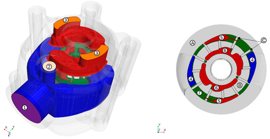 Nowadays, rising demands for improved vehicle acoustics and lower noise emissions of other components, lead to the fact that often the pump is dominant in the acoustic characteristic of hydraulic systems [3,4,5,6,7,8]. There are different ways to enhance the acoustic characteristics of a pump. One approach is e.g., to change the excitation frequencies by asymmetric spacing or to reduce the radiated noise by structural changes [3,9]. Another approach is to directly reduce the noise sources in the flow of the pump. In general, to reduce the noise radiation of a pump, a fundamental knowledge of the noise source mechanisms and the system dynamic behavior is mandatory [10,11,12]. To identify the source mechanisms of noise in the flow of the pump, a coupled CFD-FEM approach is chosen. The pump investigated in this work is a Bosch rotary vane pump for transmission applications with a displacement volume of 11.1 cm3/rev. The external dimension of the housing are 70 mm in axial direction with a diameter of 110 mm. This rotary vane pump is pictured in Figure 1. In this figure, the suction port (left picture blue part) and the delivery port (left picture red part) are spatially separated. Fluid is conveyed from the suction port, through the inlet (1) and the injector (2), to the delivery port and the outlet (3) by a set of pressure sealed displacement chambers (7). These chambers are formed by the static cam ring part (A), the static inner pump surfaces, the rotating rotor (B) and by the vanes (C), which are able to slide in and out of the rotor in radial direction. These components are pictured in Figure 1 on the right. The kinematics of the vanes is determined by the shape of the cam ring. The back vane notch (6) which is connected to the high pressure section ensures that the vanes slide along the cam ring. During the suction process the volume of a displacement chamber is increasing which leads to an inflow in the displacement chamber at the suction ports (4). Subsequently, the displacement chamber disconnects from the suction port and hence, is neither connected to the suction nor to the delivery port (5). In this phase, the volume of the displacement chamber decreases slightly, leading to a pressure rise in the displacement chamber. This so called pre-compression is already enhancing the pressure level and therefore reduces the pressure surges arising from the connection of a displacement chamber with low pressure to the delivery port with high pressure. Additionally, to ensure a smoother transition, grooves are implemented at the delivery port. These grooves connect the delivery port and the next displacement chamber, leading to a smoother volume change and hence, help to avoid high pressure surges. The optimal size and shape of these grooves is depending on the density and viscosity of the oil and the actual operating speed of the pump [13]. If the displacement chamber passes the groove and fully connects to the delivery port, the vane slides further back into the rotor. This decreases the volume of the displacement chamber leading to a fluid flow out of the chamber. The investigated pump is an asymmetric vane pump with two suction and two delivery ports. The stroke of the pump is slightly different for both delivery ports. Therefore, the pump can provide two different flow rates. The suction and delivery ports are located transversely and lead to a partly compensation of flow forces. Nevertheless, this working principle leads to flow and pressure pulsations, which excite enclosing structural elements and cause noise radiation of the pump [7,14,15]. A combined CFD-FEM approach is applied to identify which flow induced effects are crucial for the noise radiation of the pump. There are a couple of studies focusing on noise radiation of pumps. In Ref. [16] the authors investigate the fluid-borne sound of an axial piston pump by the use of a coupled 1D-3D simulation approach. The flow is modeled in a 1D simulation in AmeSim and a 3D FEM/BEM model in Virtual.Lab is used to predict noise sources and transmission paths. A similar approach is used by [8,11,12,15]. Here, the noise radiation of a gear pump is simulated using a lumped parameter model along with an FEM/BEM model. The coupling of a 3D-CFD model and an FEM/BEM model to predict the flow induced pressure pulsations and vibrations of a centrifugal pump is assessed in [17,18]. For rotary vane pumps a study using a coupled approach to analyze the structural forces acting on the rotor and vanes is presented by [19] using a 3D CFD simulation of the flow in Ansys Fluent along with Ansys Mechanical. However, there is no study to predict the fluid induced vibrations and noise radiation of a rotary vane pump using a 3D-CFD model in combination with a FEM/BEM-based model.
