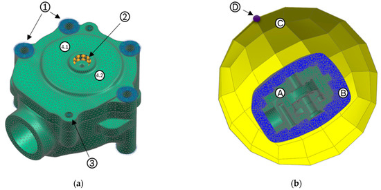In Figure 2b the meshes for the vibroacoustic model are displayed. The boundary conditions and the structural mesh (A) in the vibroacoustic model are similar to the ones of the structural model. Only the pump shaft and the gluing at the bearing positions is neglected in the vibroacoustic setup. This is justified by the investigations in Section 3.3.