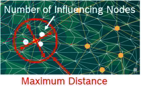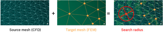 In this work, the MD method is used. The MD method loops over all the target mesh nodes (FEM-Nodes) and searches within a user defined search radius (Maximum Distance) for nodes of the source mesh (CFD-mesh). Subsequently, the user defined number of nodes (Number of Influencing Nodes) of the source mesh within this search range is considered to contribute to the target mesh node and the variable is interpolated (distance weighted) to the node of the target mesh (see Figure 4).