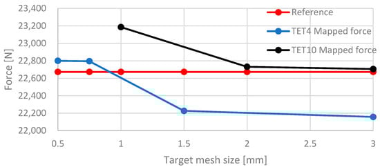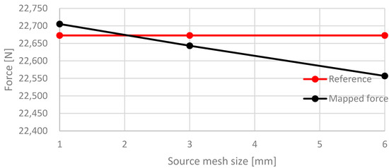It is clearly visible, that a larger source mesh size leads to a loss of information and hence, the force sum drops below the reference force derived from the original CFD mesh, if the mapping parameters are held constant. This is caused by the lower number of source mesh nodes within the search distance of the target mesh. That means some target mesh nodes, which should have a load are not able to find a corresponding source mesh node within the search distance. This effect is vice versa for smaller source meshes. Some nodes, which should not have a load are able to find a source mesh node within the search radius. Consequently, the force sum transmitted to the target mesh increases, because source nodes are considered multiple times for the mapping process. The influence of the target mesh size can be seen in Figure 8.
