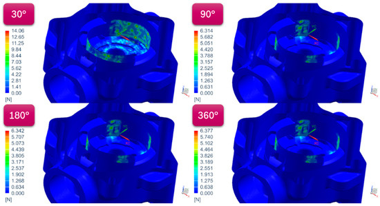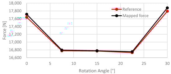 From Figure 9 it is visible, that the mapping error depends on the actual angular position of the pump rotor. While at a rotation angle around 0° and 30° the mapping error is higher (at about 0.5%), the mapping errors for 7.5°, 15° and 22.5° are lower (at about 0.1%). This could be traced back to pressure surges occurring at 0° and 30° in the CFD model (also visible by the higher force sum). These pressure surges are tracked in a high number of small computational cells, which could lead to an overprediction in the FEM model, if mesh nodes of these cells are considered multiple times during the mapping action. However, the overall mapping error is still less than 0.5% and consequently, the mapping procedure does not significantly affect the results.