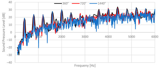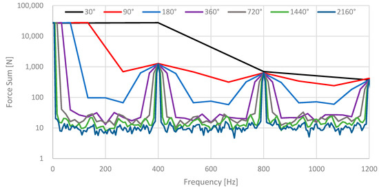 The minimum number of revolutions, which can be used for the time to frequency conversion, is pump revolution. Note that the CFD simulation has to be already at a steady state condition, when the pressure field is stored. The obtained forces for 30°, 90°, 180°, 360°, 720°, 1440° and 2160° rotation angle of the pump are investigated for a rotational speed of 2000 rpm (see Table 2). The time step size is 4.16E-05 s for all simulations and the maximum resolvable frequency derived by Equation (4) is 12,000 Hz. The results are pictured in Figure 10.