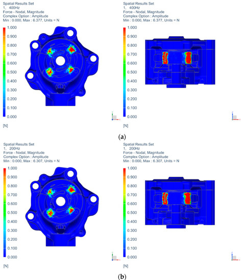 Figure 12 displays the acting forces on the pump housing resulting from the static pressure acting on the FEPS at different operating conditions. The resulting forces are pictured at the blade passing frequency for 2000 rpm and 15 bar (a) and for 1000 rpm and 15 bar (b). The locations in Figure 12, where the highest forces are tracked for the blade passing frequency match with the locations of high forces at k-times the blade passing frequency. These frequencies were chosen for evaluation, because the highest noise radiation of the pump takes usually place at the blade passing frequency and its harmonics. Regarding Figure 12a,b only small differences in the locations of high load can be observed. In the top view four locations of high load can be identified. These locations are similar for different operating points and are located between the pressure and the suction port. The spatial extend of these locations with high forces matches the angular extend of a conveying chamber of the pump (here 30°). The locations where high forces occur can be traced back to the pressure signal of the vane pump (compare Figure 18), which shows a pressure rise from about 1 bar at the suction port to the pressure level of the delivery port or vise versa at these locations. At these locations additional pressure surges may arise, if the pump is not optimized for the operating condition. This is caused by the instantaneous connection between a chamber with low pressure and the delivery port. The blade passing frequency always shows the highest force amplitudes (compare Figure 10). The magnitude of the forces at the blade passing frequency is mainly depending on the pressure difference from suction to delivery port. If the rotational speed of a pump is increased, the blade passing frequency with the highest force amplitude as well as its harmonics are shifted to higher frequencies. Therefore, the pump housing is excited at higher frequencies.