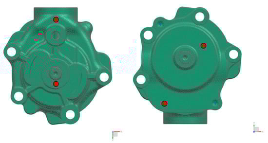 To verify the conclusion that the FRF have less impact on the noise radiation of the pump, the excitations of the pump housing resulting from the FRF and from the static pressure acting on the FEPS are investigated. The simulations are performed using the FEM setup for the structural model described in Section 2.2. One simulation is performed only considering the FRF in form of a rotor torque and one simulation only considering the forces due to the static pressure acting on the FEPS. To estimate the magnitude of the excitation by the rotor torque, the shaft is glued to the pump housing at the bearing positions. In the real pump the axial shaft position is derived by the pressure forces in the fluid. The plain bearings are lubricated by a leakage oil connection to the conveyed oil. Therefore, the shaft can usually not handle axial forces and has only a rotational degree of freedom. Hence, the excitation through the rotor torque is exaggerated in this model. To evaluate the impact of the FRF and the pressure field acting on the FEPS, the velocity at four representative positions at the outer surface of the pump housing is analyzed and compared. The locations are pictured in Figure 13 in red. The outer surface of the pump housing is chosen, since the noise radiation outside of the pump, which excites the surrounding air, is of interest. Subsequently, an average of the surface velocity of these four locations is calculated. The average can be seen in Figure 14. The evaluated frequencies of this investigation range from 100 Hz to 1300 Hz with a step size of 100 Hz. The rotational speed of the underlying simulation is 2000 rpm and the pressure load is 15 bar. Hence, the first blade passing frequency and two harmonics can be observed.