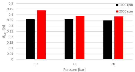 This is underlined by simulations at different delivery pressures and rotational speeds, too (see Figure 15). Here, the ratio of the surface velocity caused by the FRF with regard to the surface velocity caused by the pressure acting on the FEPS is visualized. For that purpose, an average value of the surface velocity at the four surface nodes of the pump housing is calculated similar to the previous investigation. Additionally, the results at the blade passing frequency and at two harmonics are averaged to achieve a representative single value (see Equation (10)):