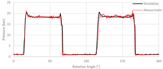 On the one hand it can be seen, that the characteristic pressure curve could be captured well. On the other hand, at the second delivery port some fluctuations in the high pressure section of the measurement which are not captured by the simulations are visible. These may result from interactions with the connected system. Additionally, the high frequency fluctuations visible in the measurement cannot be captured by the CFD simulations. Possible causes for these fluctuations are vibrations of the pump housing and pipes, which interact with the fluid in the pump [20]. Overall, the simulation and the measurement show a reasonable agreement.