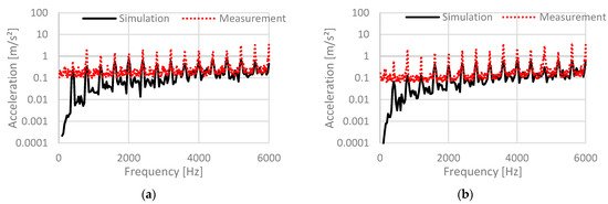To validate the results of the simulation model, the surface acceleration of the model and the measurement is compared for the two different sensor positions (see Figure 2a). The results are displayed in Figure 19a,b.