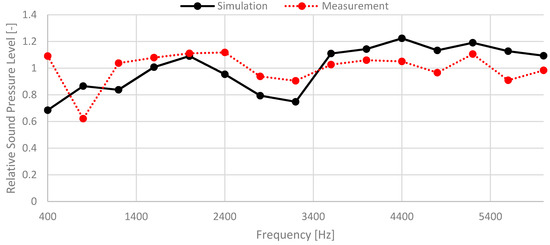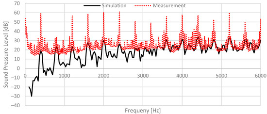These figures show that the blade passing frequency and its harmonics are clearly visible in the simulation and in the measurements. However, the simulation underpredicts the accelerations over the whole evaluated frequency range. While there is a huge deviation at low frequencies up to 2400 Hz, the agreement at higher frequencies becomes better. The accelerations at the frequencies between the blade passing frequencies are in a reasonable agreement with the measurements above 4000 Hz, while the acceleration amplitudes at the blade passing frequency and its harmonics are still underpredicted. In the next step, the sound pressure level at the microphone point is compared to the measurement. The results can be seen in Figure 20.