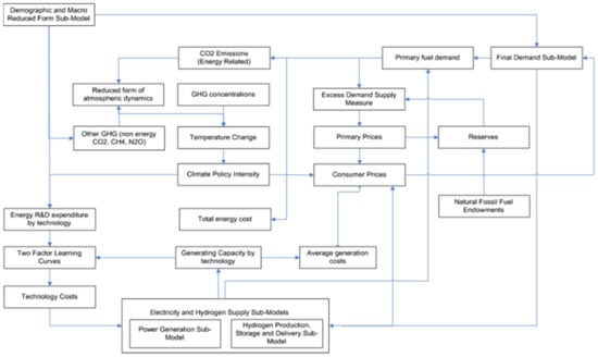 PROMETHEUS is a fully-fledged world energy system model, which represents in detail the potential developments in the energy sector under alternative policy and technology scenarios until 2050 []. The model combines a top-down simulation of energy demand by sector, largely based on econometrically estimated equations, with a bottom-up representation of energy, electricity, and transport technologies and infrastructure. By including a complete accounting of energy demand and supply by sector and energy product, PROMETHEUS simulates the complex interactions between demand and supply to form market equilibrium at the regional and global energy markets with endogenous formulation of energy prices. PROMETHEUS includes specific modules for the macro-economy, energy demand by end-uses, electricity and hydrogen production, energy pricing, CO2 emissions from fossil fuels, hydrocarbon supply and technology learning. The modules are linked together to form a comprehensive global energy system model (Table 1) and interact with each other through their common variables and system constraints (e.g., on emissions or renewable energy targets).