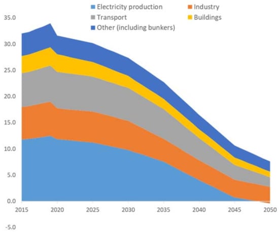 The application of universal carbon price from 2020 onwards would result in a large decline of global CO2 emissions from fossil fuel combustion (Figure 2). Here, it should be noted that due to COVID-19 pandemic, global CO2 emissions have decreased by about 7% in 2020 from 2019 levels []. The analysis shows that the 2DEG-OPT would lead to a constant decline of emissions, starting already in 2020 with the emission peak happening already in 2019, while in previous assessments, the peak was projected later, around 2025 []. This points to the need of formulating ambitious green policy measures in the context of socio-economic recovery from COVID impacts [] aiming to contribute to sustainable development and avoid a rebound of emissions once global activity starts growing again. In the 2DEG-OPT scenario, the increasing carbon price drives an extensive reduction of global CO2 emissions, which are projected to decline by 19% in 2030, 48% in 2040, and 76% in 2050 relative to their 2020 levels. The electricity sector is the first to decarbonise with coal-fired based generation rapidly declining by 2035, while emission reductions from demand sectors are mostly driven by energy efficiency improvements, electrification of energy services (e.g., through electric vehicles and heat pumps) and fuel switch towards low-carbon energy carriers, including biofuels and hydrogen. In 2050, global CO2 emissions amount to only 7.4 Gt, which is in line with IPCC Assessment [] and mostly derive from hard-to-abate sectors, such as heavy industry, freight road transport, and bunkers. The electricity sector is fully decarbonised by 2045 based on large scale expansion of renewable energy and CCS technologies, while the emergence of BECCS after 2045 leads to net negative emissions from global electricity production in 2050.