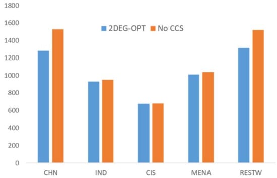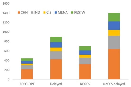 Most of stranded assets are projected in China and India (ranging from 210–620 GW to 83–274 GW, respectively, across decarbonisation scenarios), while significant amounts of stranded assets are also found in MENA and RESTW regions. The lowest volumes of stranded assets are projected in the 2DEG-OPT scenario where CCS technologies are massively deployed. These findings confirm that coal may continue to be used in China (at significantly lower levels than today), while a strategic prioritisation of early power plant retirements based on technical, economic and environmental considerations may decrease the risk of stranded assets and enable a near-complete phase-out of coal-fired plants without CCS by 2050 []. The risks for stranded assets could be significantly reduced by retrofitting fossil fuel-fired power plants with CCS, with the amount of stranded assets declining by about 33–40% across developing economies. In contrast, delayed climate policy action leading to the construction of new coal power plants in developing economies by 2030 would significantly increase the risks of stranded assets in order to meet the stringent climate constraints (Figure 10).