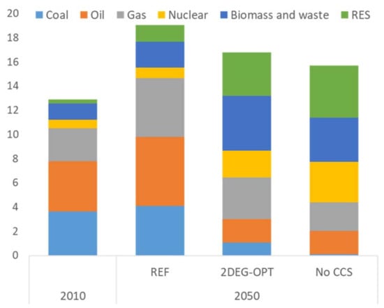 In the absence of ambitious climate policies, the reference scenario shows a continuation of past trends with fossil fuels dominating the global energy supply, but with a slightly declining share (from 81% in 2015 to 74% in 2050), driven by technological improvements in renewable energy technologies, increased fossil fuel prices, and energy intensity improvements. The decarbonisation scenarios result in a drastic change of primary energy supply mix, with a rapid increase in the share of renewable energy, from 13% in 2010 to 47–52% in 2DEG scenarios in 2050, largely driven by the rapid uptake of solar and wind power and advanced biofuels to reduce emissions from the electricity and transport sector respectively. In addition, energy requirements decline from Reference levels driven by energy efficiency measures in households, industries and transport, deep renovation of buildings and uptake of more efficient energy carries (e.g., electricity), equipment and technologies (Figure 4). These trends imply that global fossil fuel consumption would decline by 39–58% over 2010–2050, in line with IPCC findings []. When comparing the two 2DEG scenarios, fossil fuel consumption is higher in 2DEG-OPT as CCS technologies are used to eliminate emissions from fossil fuel-fired power plants. In case that carbon capture is not available (NOCCS scenario) other mitigation options, including renewable energy, nuclear power and energy efficiency, are more aggressively deployed.