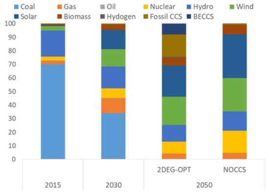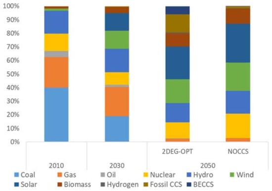 The model-based analysis confirms that the electricity sector is the first to decarbonise in the medium-term (in line with [,]), as several emission reduction options are already available and cost-competitive with fossil-fired power plants in most regions (e.g., solar PV, onshore and offshore wind, hydro). The share of coal is projected to decline by half over 2015–2030, demonstrating that large emission reductions can be achieved with substitutions towards cleaner electricity producing technologies replacing carbon-intensive options (Figure 5). Renewable energy technologies are massively deployed globally, driven by their reduced costs combined with increased costs to use fossil fuels due to high carbon pricing. The share of RES in global power generation increases from 20% in 2010 to 48% in 2030 and further to 72–78% in 2050 (including hydro and biomass), while nuclear power also expands from 11% in 2015 to 13–18% in 2050. The absence of CCS implies that, in order to achieve the same emission goal, the deployment of nuclear and renewable energy should be higher relative to the cost-optimal 2DEG-OPT scenario, requiring additional amounts of capital-intensive investment in nuclear power plants, wind farms, PV installations and hydro-electric plants. In all cases, global power production is almost fully decarbonised by 2050 with the share of unabated fossil fuel fired plants declining to only 3% in 2050, mostly through gas-fired power plants that provide flexibility and balancing services to accommodate the large amounts of variable renewable energy in the system. The deployment of carbon capture depends on specific scenario assumptions, with CCS technologies accounting for about 19% of global power requirements in the 2DEG-OPT scenario, as they can provide a dispatchable emission abatement option to balance weather-dependent electricity generation (Figure 6). CCS options are combined both with fossil fuels and with biomass in the form of BECCS leading to net negative emissions.